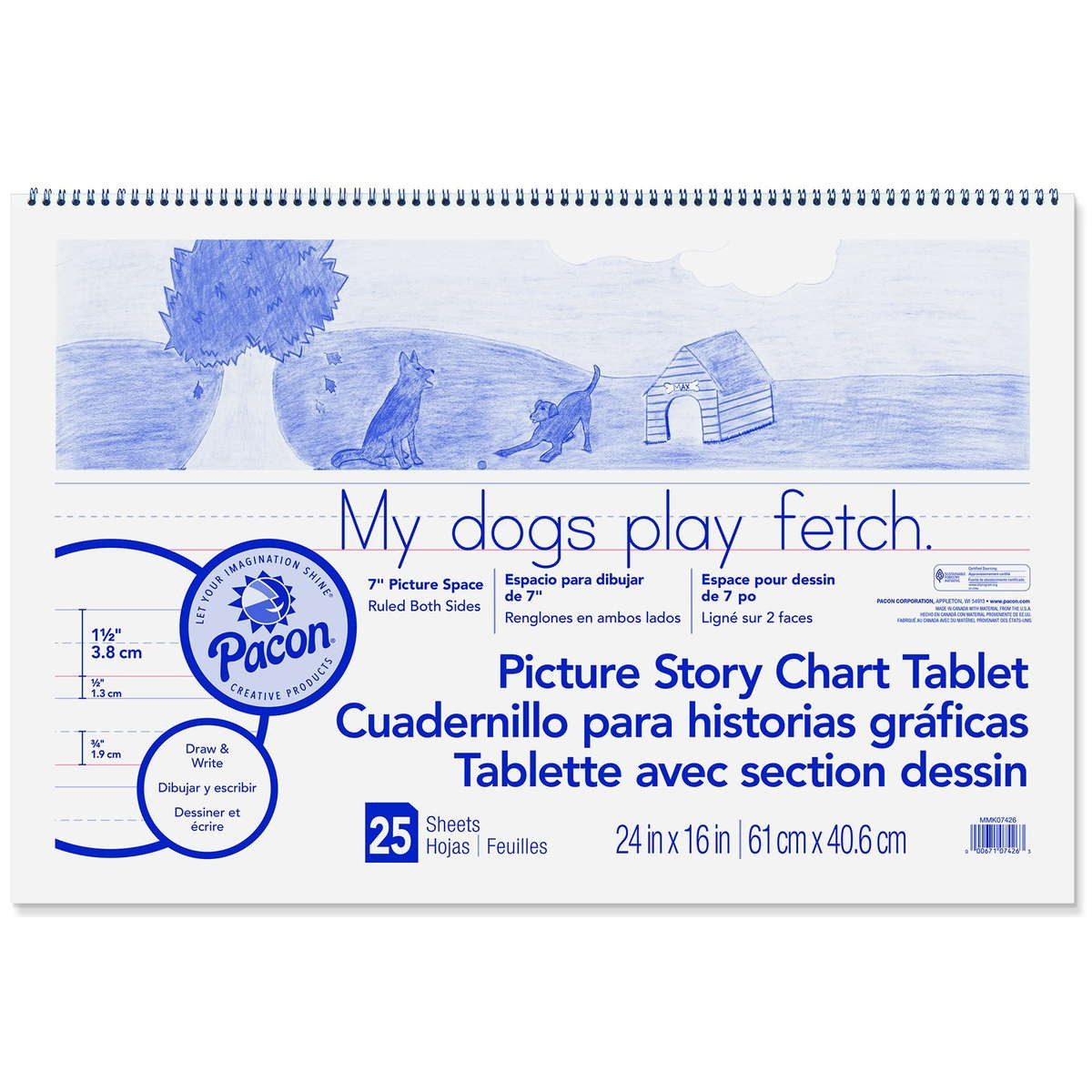 White sulphite bond paper spiral bound to stiff covers. 2-hole punched. Ruled both sides. 24" x 16" tablets are ruled the long way. 25 sheets. Recyclable.