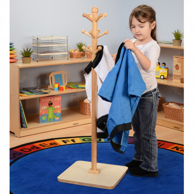 Pretend play apparel will be at children's fingertips with this 42" H space saving clothes tree. Constructed of sturdy hardwood, it features twelve strategically places, screw in 3"L ball-tipped limbs and a stable 15" sq x 1" thick wooden base. Minimal assembly. (Hats and clothes are not included)