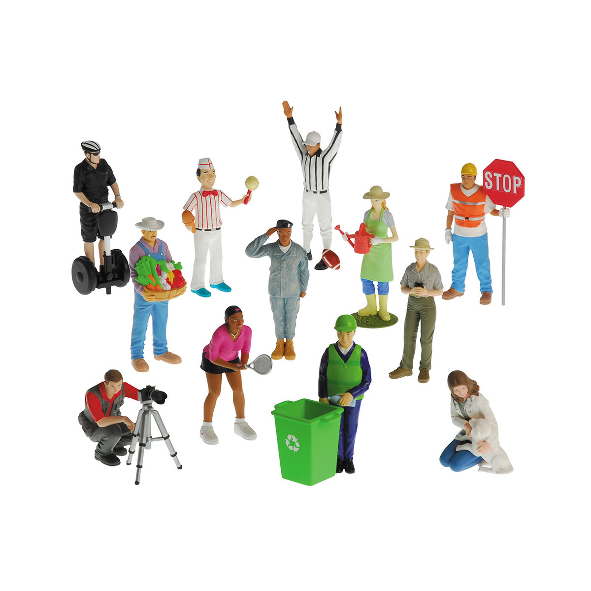 These 12 career figures reflect the community and the people in the world around us. Most figures are 5″ H. Ages 3 yrs. +