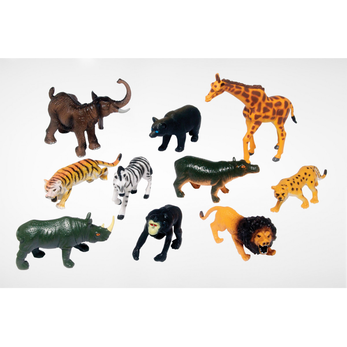 These 10 jungle animals are accurately scaled, colored and reproduced in a firm, sculptured vinyl. Giraffe is 4½” H. Ages 3 yrs. +.