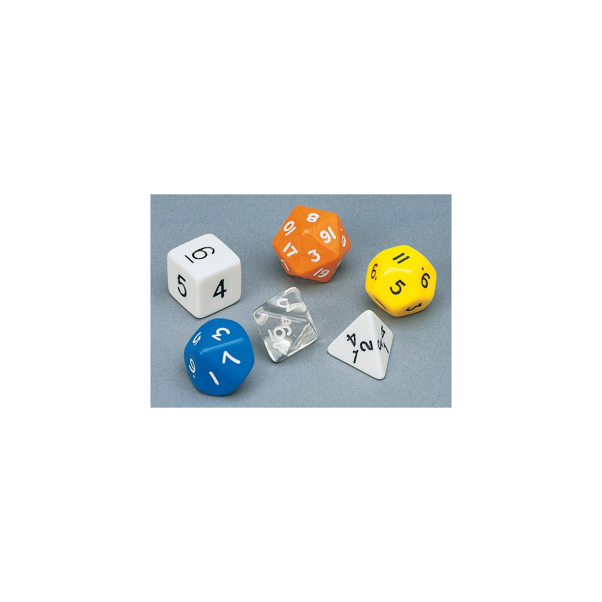 Set includes hexahedra, tetrahedra, octahedra, dodecahedra, icosahedra and decahedra dice.