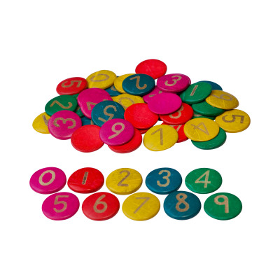 This set features circular, brightly colored coconut shell pieces with 10 sets of numbers 0-9 imprinted into the surfaces. These manipulatives are made from real coconut shells and retain their original concave shape and natural grain. The vibrant colors and imprinted numbers make them ideal for counting and sorting, and the tactile surfaces engage multiple senses. Perfect for numeracy activities, pattern-making and nature-inspired crafting. These eco-friendly counters bring the outdoors into the playroom, supporting hands-on exploration and loose-parts play. Color quantities may vary. Size: 1"D