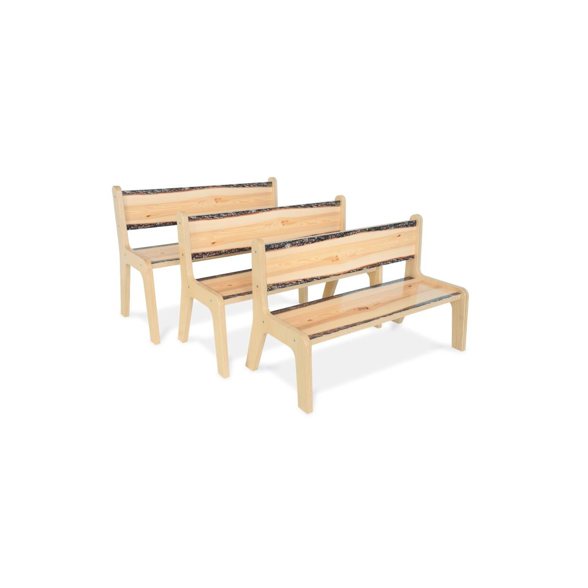 A rustic looking outdoor bench for indoors! Our Nature View Live Edge Benches accommodate two children and mimic the look of live edge wide plank furniture with charming realism in 10", 12" and 14" seat heights.