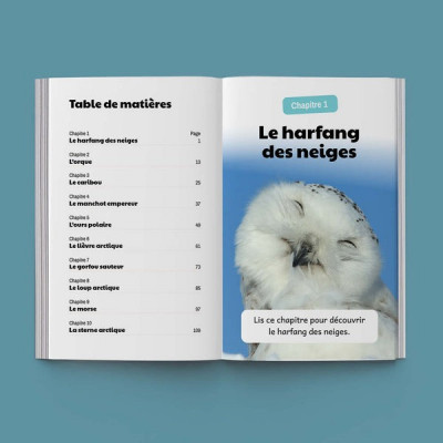 Découvrez une tonne d’informations intéressantes sur dix animaux polaires dans ce livre documentaire : le harfang des neiges, l'orque, le caribou, le manchot empereur, l'ours polaire, le lièvre arctique, le gorfou sauteur, le loup arctique, le morse et la sterne arctique.