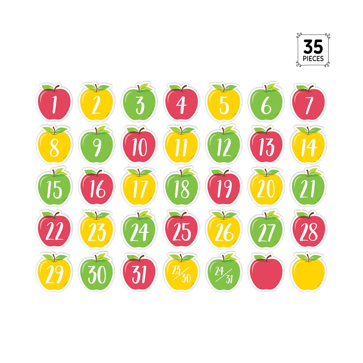 Set the stage for a delicious month by adding these colorful Apple Calendar Days to your classroom calendar chart. Pack contains 31 number days, 2 combined number days (23/30 and 24/31), and 2 blank days for highlighting special events or holidays and recognizing birthdays. Calendar Days are great for use on a classroom calendar during the daily calendar lesson or circle time. They can also be used as student numbers to label cubbies, folders, desks, and more! These Calendar Days go great with the decor items in our Apple Time Collection.