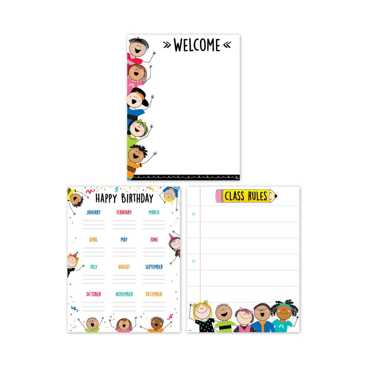 The charts in this Stick Kids Classroom Essentials 3-Chart Pack will complement a wide variety of classroom themes and decor. The bright colors and happy, culturally diverse Stick Kids will liven up any classroom. Pack contains a welcome chart, birthday chart, and class rules chart. Essential charts for any classroom!