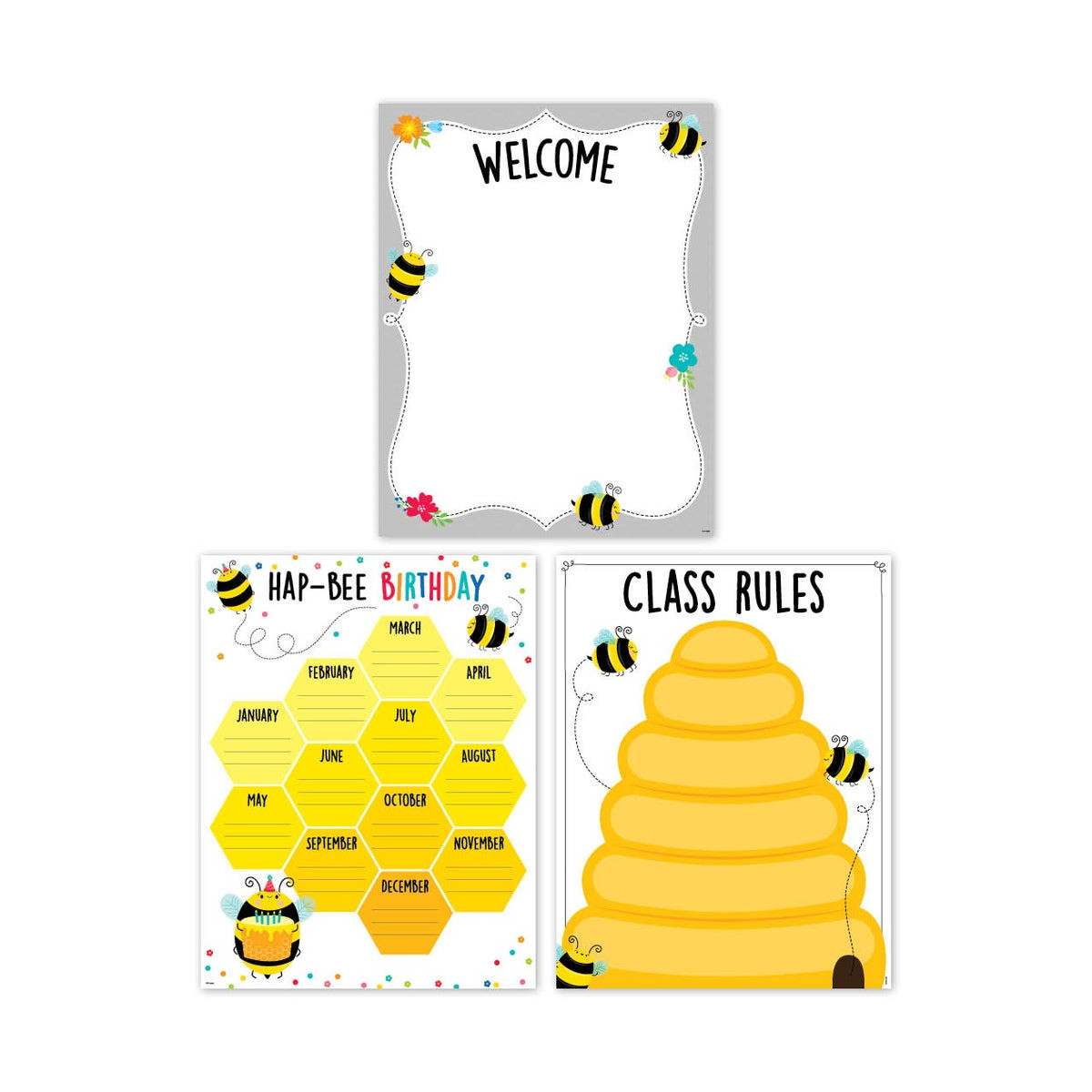 The bright colors and fun designs in this Busy Bees Classroom Essentials 3-Chart Pack make these charts a stylish way to organize and communicate important information in any classroom. Pack contains a welcome chart, birthday chart, and calendar chart.Pack comes with 3 classroom charts: