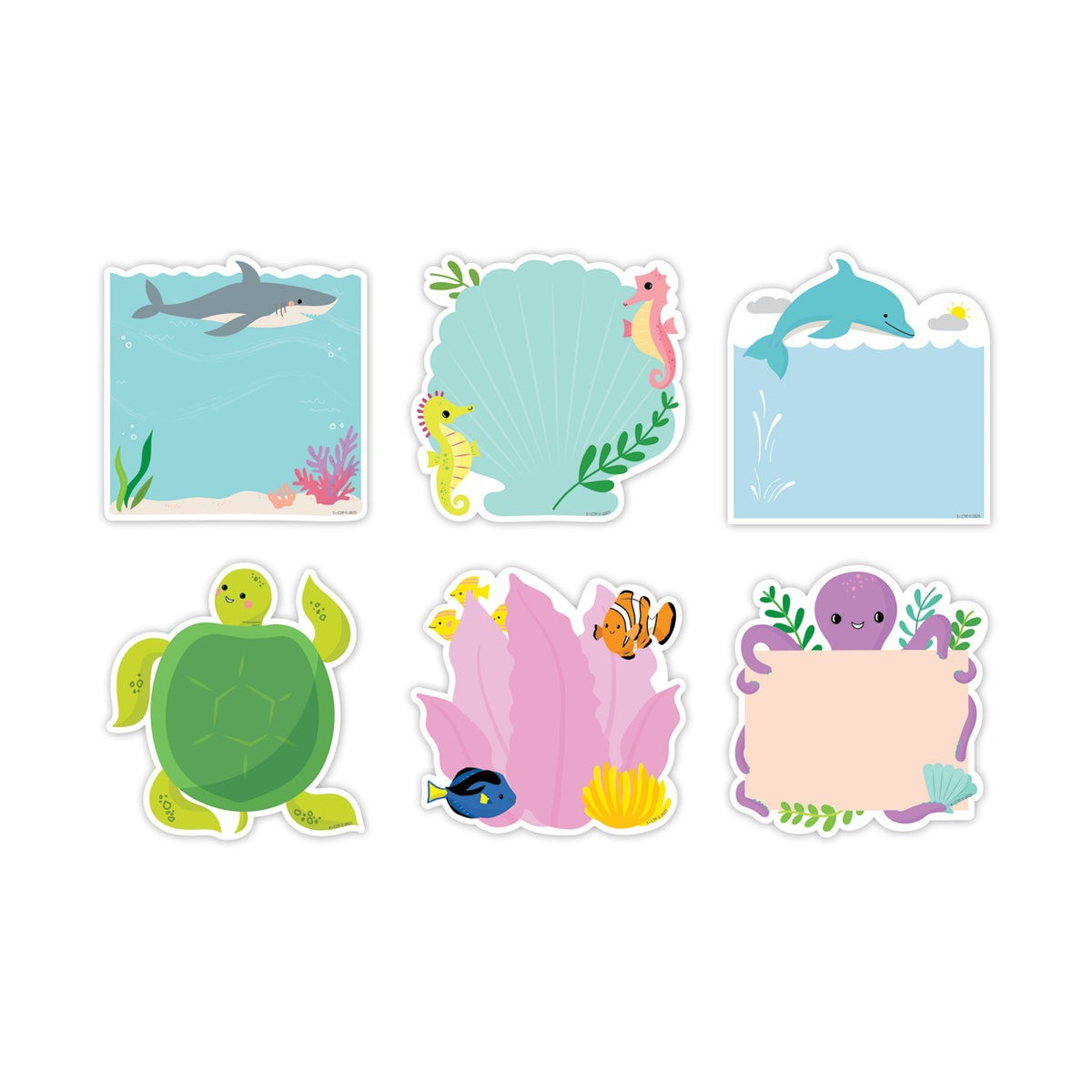 Make your class messages memorable with these Sea Friends 6” Designer Cut-Outs, which feature favorite ocean animals, such as the shark, dolphin, sea turtle, seahorse, octopus, and tropical fish. These cut-outs are perfect for class notices, writing assignments, learning center activities, accenting bulletin boards, and more! Use them to give special recognition for a job well done or to write a positive note to a student or parent. The cut-outs can also be used to make quick and easy labels on cubbies, student folders, supply bins, and binders.