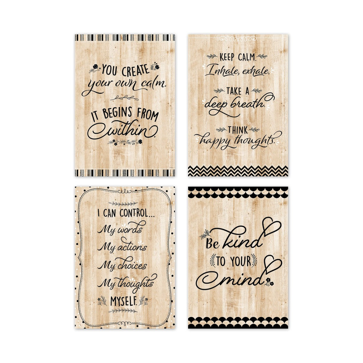 Tips for remaining calm in stressful situations are featured on the charming posters in our Black, White, and Wood Inspire U 4-Poster Pack. Each poster features a helpful reminder with messages ideal for children and adults alike. These posters feature style with black and white core patterns on a neutral wood background are perfect for display in a school, at home or anywhere a little inspiration is needed.”