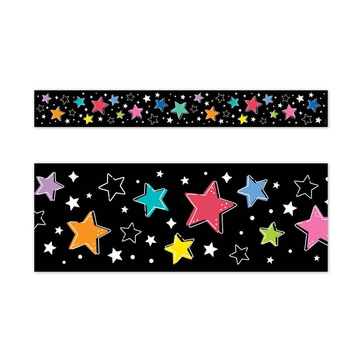 This Colorful Stars on Black EZ Border is a dazzling way to trim displays of stellar student work! The multicolored stars popping out of a black background are sure to brighten any room. This EZ Border comes in smaller strips, which are easier to manage and store. Each package comes with enough border to complete 2 full bulletin boards.