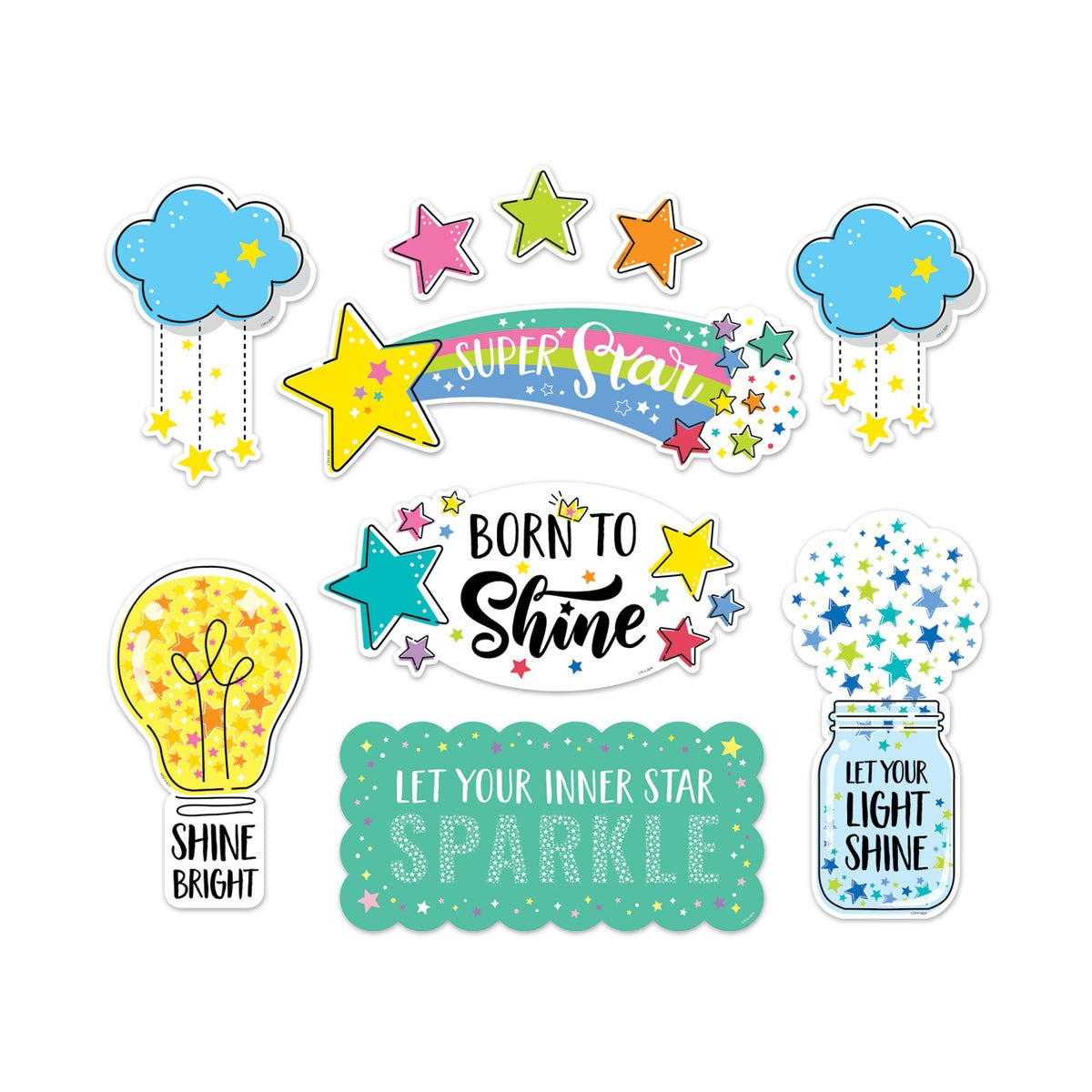 Ready. Set. Shine. Make this the year to be your best you! Celebrate the shining stars in your class with this Star Bright Positive Thinking Mini Bulletin Board! This dazzling set is perfect for inspiring students, featuring outstanding work, and adding style to any display. Use the colorful shooting stars, Décorative clouds, and motivational headlines to encourage students to shine bright all throughout the year.This 23-piece set includes: