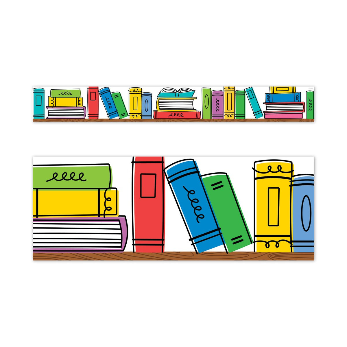 This Doodle Bookshelf EZ Border depicts an array of colorful books on a shelf, perfect for trimming bulletin boards in readin...