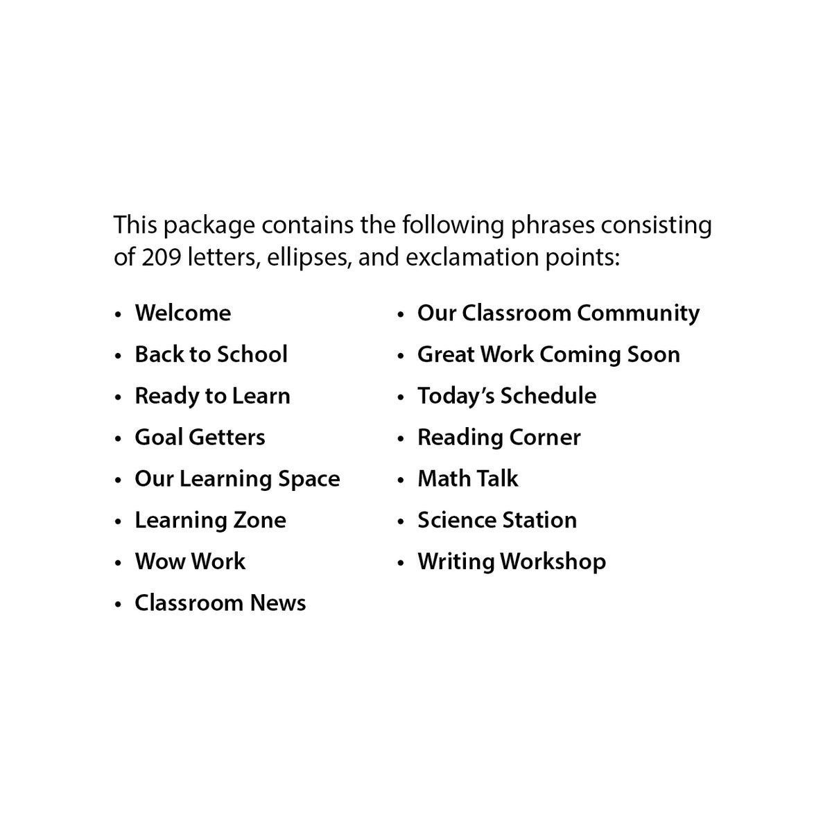 This set of School Time 4” Punch-Out Phrases comes with the letters to spell out 15 commonly used classroom expressions. Post these phrases in your room to welcome students, label special classroom areas, celebrate student work, display the day’s schedule, feature class news, and express positive affirmations.