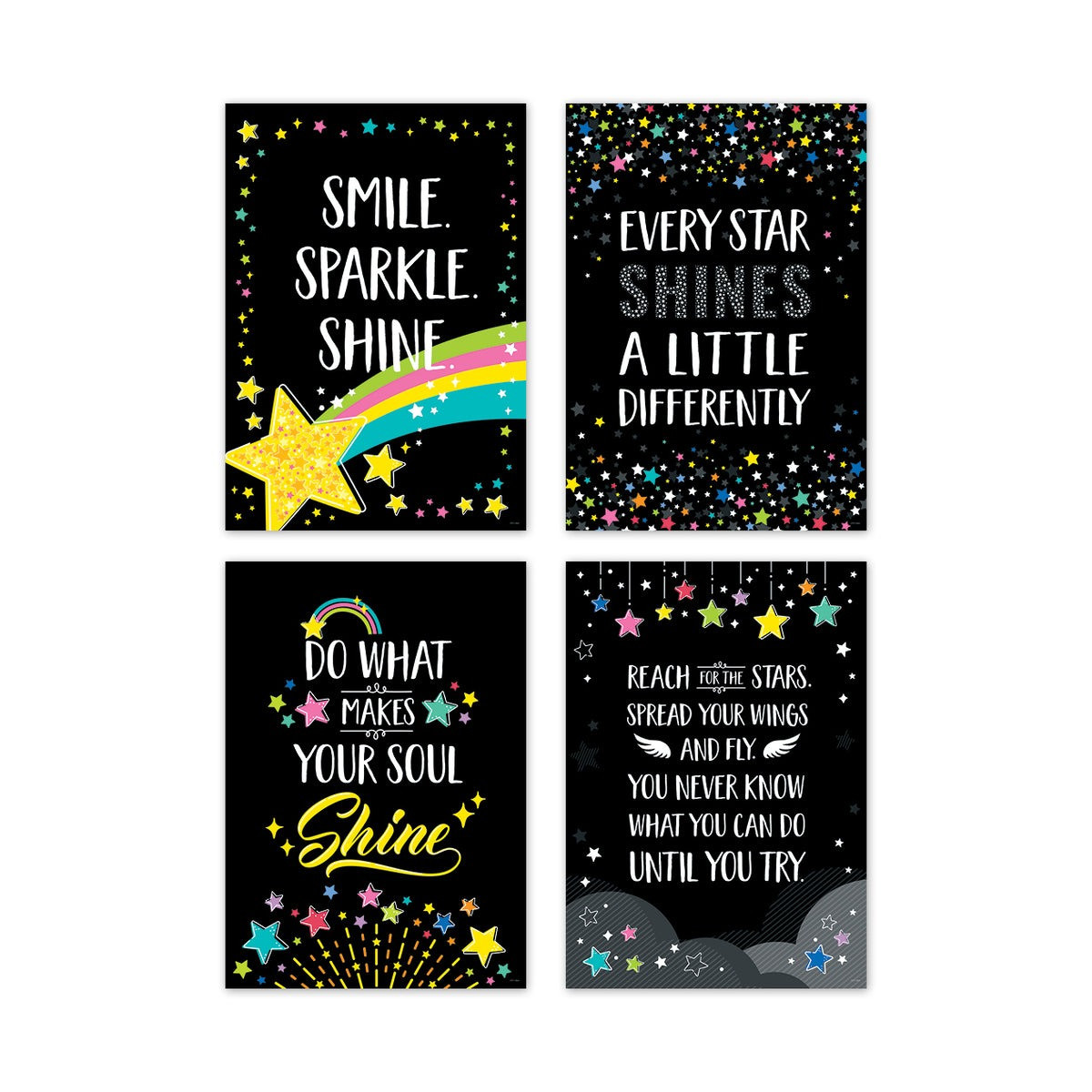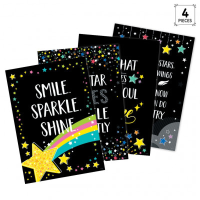 Encouraging advice to help individuals become the best versions of themselves is featured on the star-studded posters in this Star Bright Inspire U 4-Poster Pack. The posters’ colorful stars on a black background make for a dazzling look that will add vitality and glamour to any room. Perfect for display in a school, at home or anywhere a little inspiration is needed.
