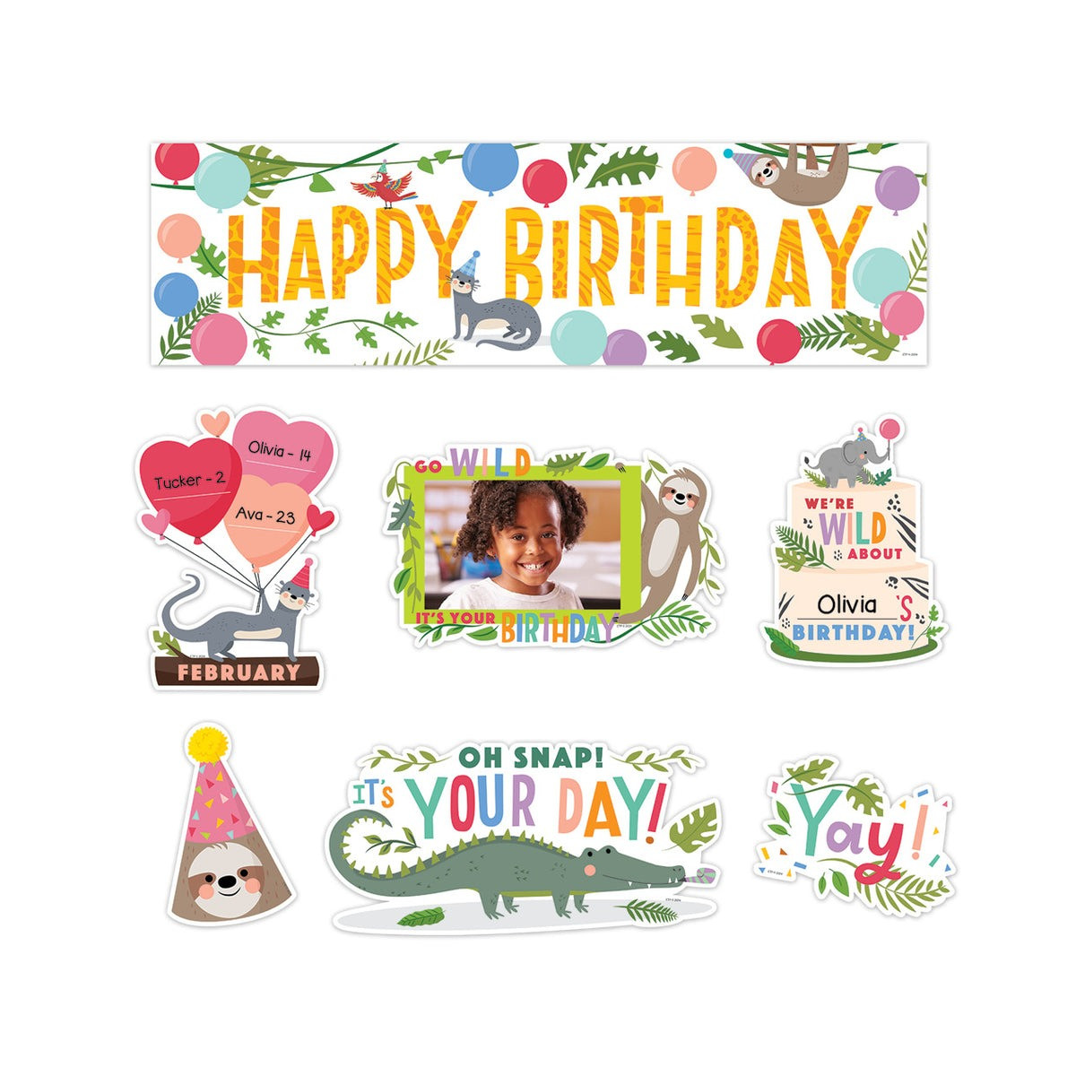 Celebrate class birthdays jungle style with the friendly animals in this Happy Birthday Mini Bulletin Board. This colorful set depicts favorite jungle animal interacting with seasonal accents to create a fun reminder of the birthdays recorded on each monthly piece. The cheerful colors and happy design make this perfect for use in any school or daycare center.