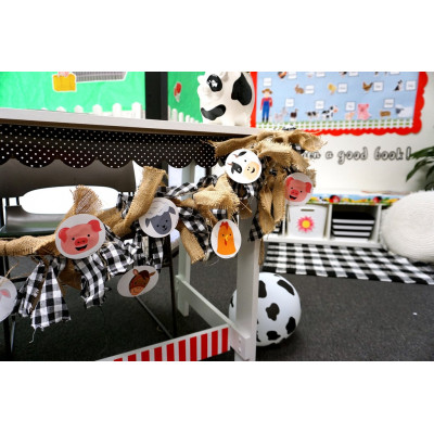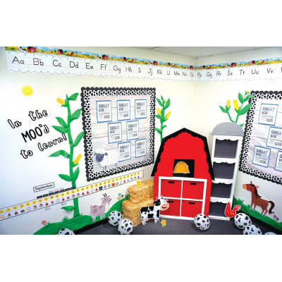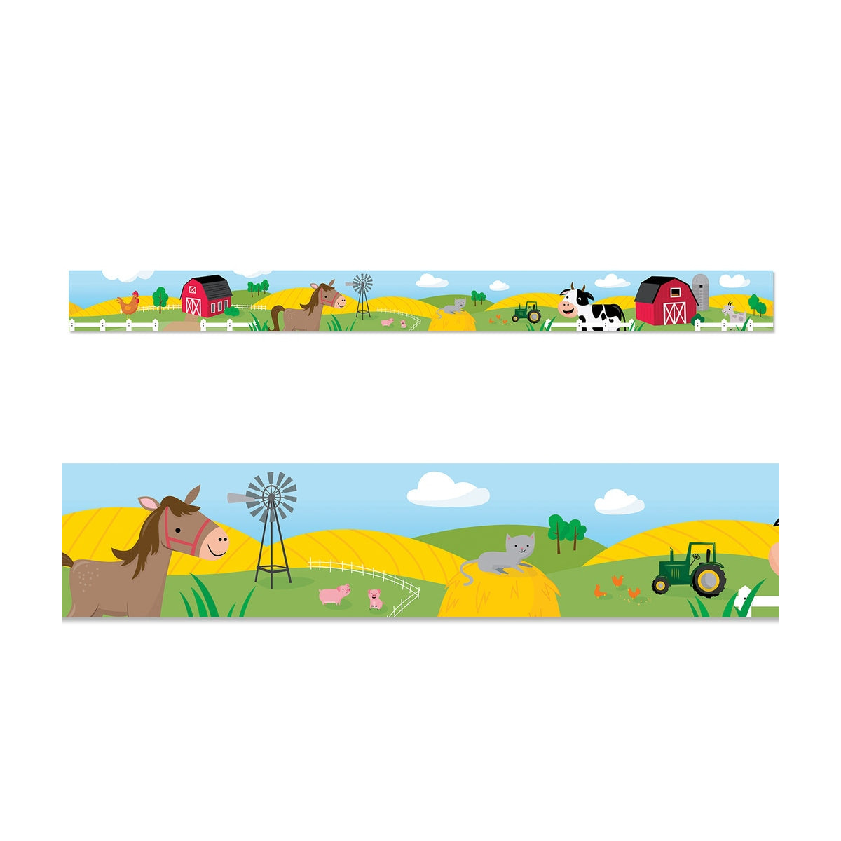 Take students on a visit to the farm! This Farm Friends On the Farm EZ Border features rolling green hills, yellow fields of crops, a tractor, a big red barn, and farm animals. Perfect for an early childhood farm bulletin board. These new EZ borders come in smaller strips, which are easier to manage and store. Each package comes with enough borders to complete 2 full bulletin boards.