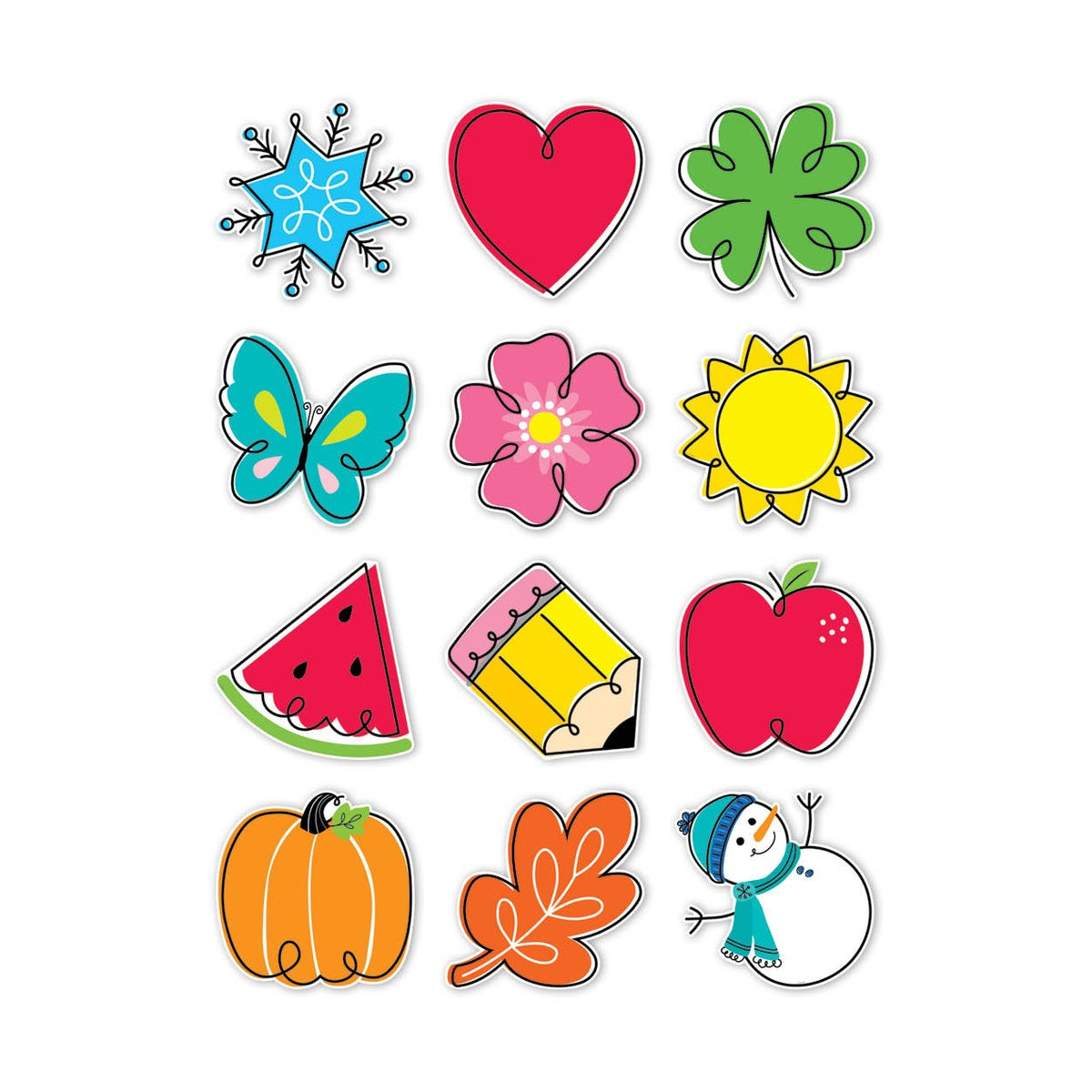 Adapting your wall display to fit the season is a snap with these Seasonal Accents 10" Designer Cut-Outs. The whimsical Doodle design of these 12 big cut-outs represent decorations for fall, winter, spring, and summer, as well as holiday decorations for Valentine’s Day, St. Patrick’s Day, Halloween, and Christmas.