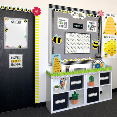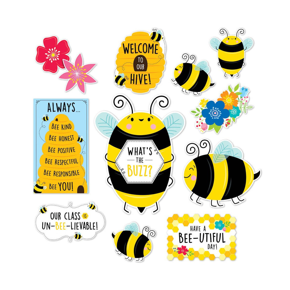 Create a bee-utiful buzz in your learning space with the Busy Bees Bulletin Board Set! The bold black and gold bee and hive pieces in this set are sure to draw attention to the positive, welcoming messages included that will inspire young learners to bee-have their best and bee-lieve in themselves.