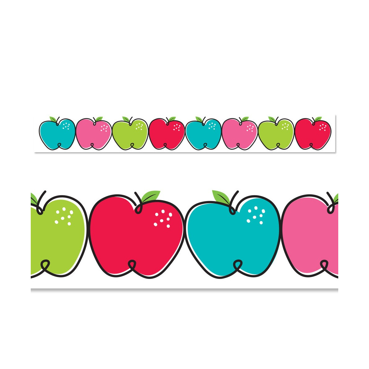 Dress up bulletin boards, rooms, hallways, and common areas with the bright colors and whimsical designs in this Doodle Apples Border. This versatile border is perfect for a variety of bulletin boards and classroom decoration themes. These new EZ borders come in smaller strips, which are easier to manage and store. Each package comes with enough borders to complete 2 full bulletin boards.