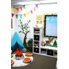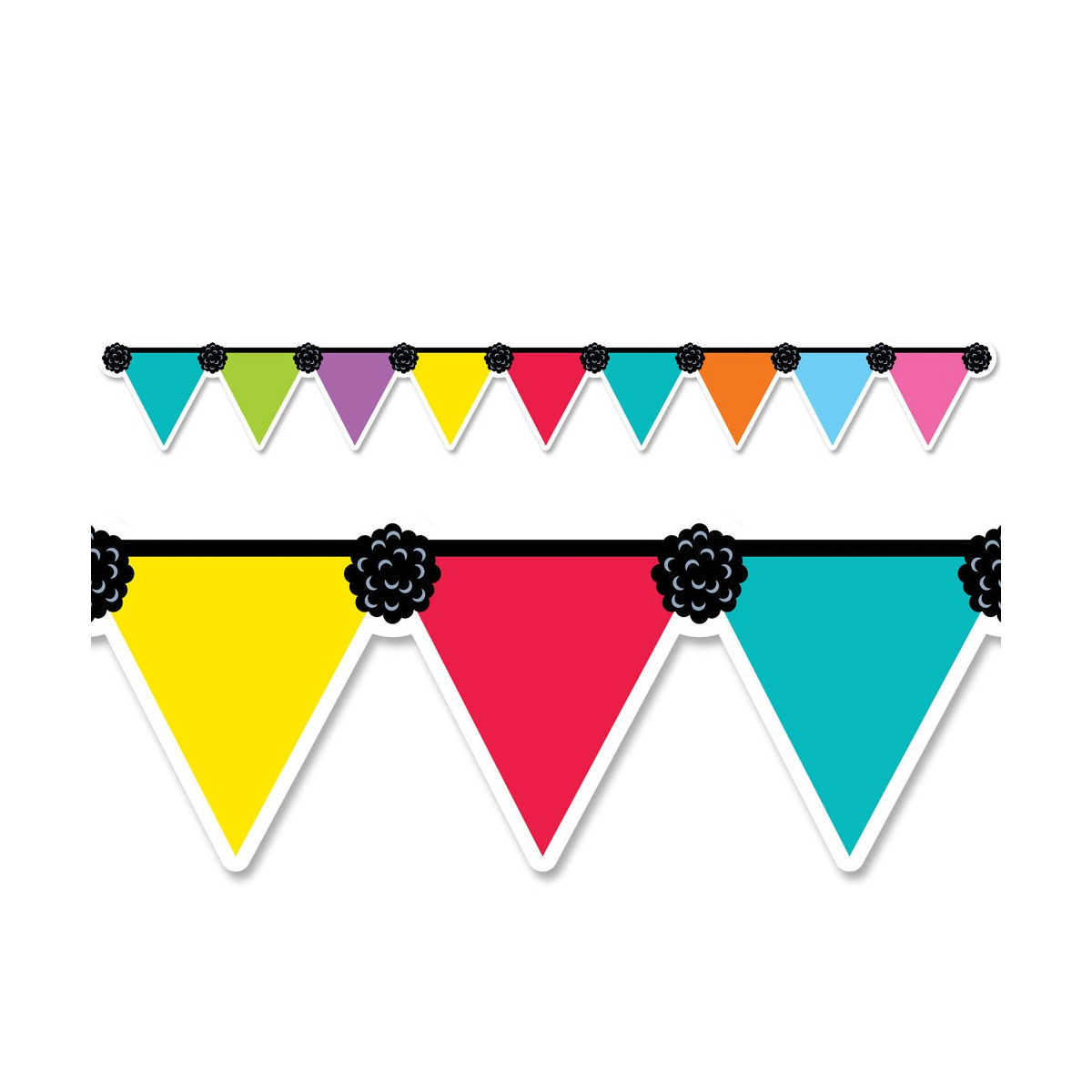 A party isn't complete without pennants! This festive Pennant Party Border depicts a rainbow of colored pennants on a black string with black pom-pom accents! The versatile color palette will nicely accent any birthday or other celebratory bulletin board at a school, office, church, college dorm, or senior living residence. These new EZ borders come in smaller strips, which are easier to manage and store. Each package comes with enough borders to complete 2 full bulletin boards.