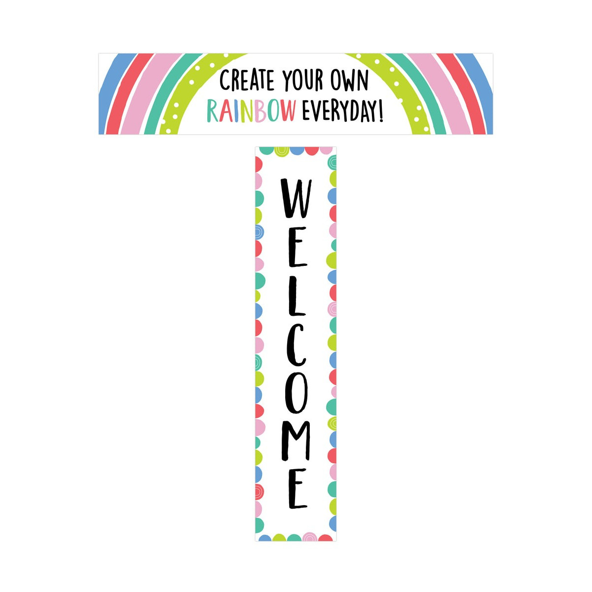 Use this Welcome Banner anywhere you need a bright message or bit of inspiration! This versatile 2-sided banner features a different message on each side—Side 1: "Welcome" and Side 2: "Create your own rainbow everyday" It can be used during back-to-school to welcome students and parents then flipped over for a motivational message for the rest of the school year.