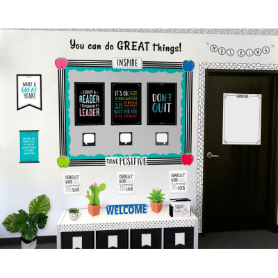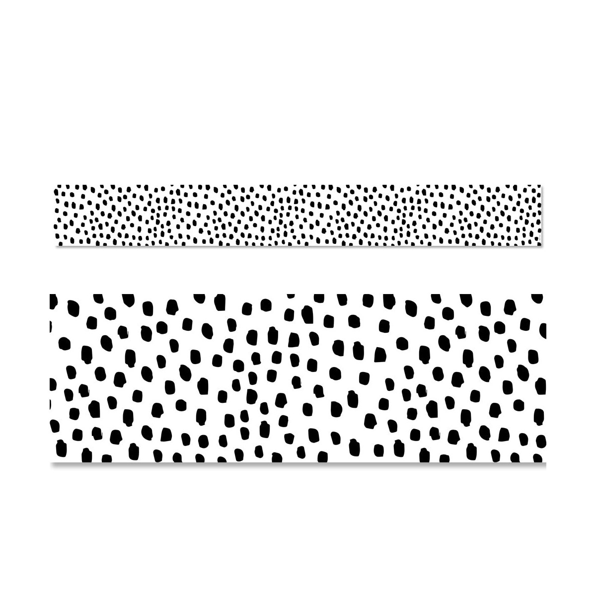 The newest trend in polka dots are messy dots! This Core Decor Black Messy Dots Border features whimsical black polka dots on a white background. This is a bold and versatile way to trim any bulletin board or classroom display. Perfect for any type of school setting at any grade level! Also great for use in an office, a church, a college dorm, or a senior living residence. With its simple design, this bulletin board border can be used alone to create a basic look or layered with another border for a more designer look.