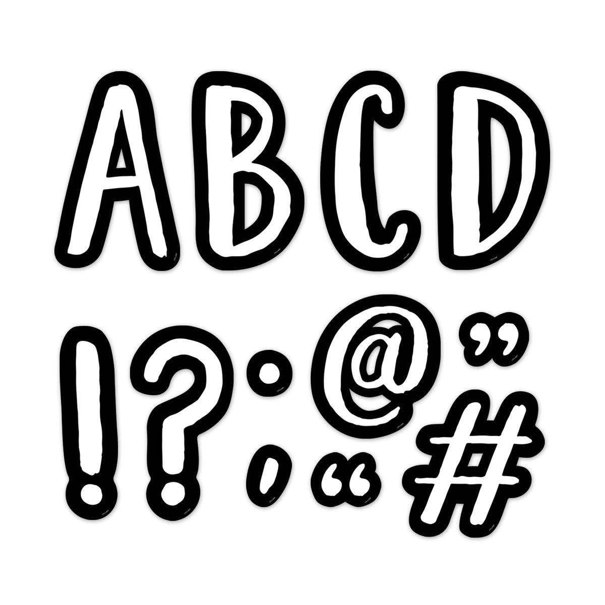 Create big, eye-catching headlines with Café 7" Designer Letters! These script-style punch-out letters are white in the center with a thick black edging, making them highly visible from a distance. This package includes 120 pieces—uppercase letters, punctuation marks, and symbols. The casual, modern design of these punch-out letters makes them versatile for use on any bulletin board or display in a school, office, college dorm, senior living residence, church, or daycare center. Great for party signs, hallways, and other large spaces.