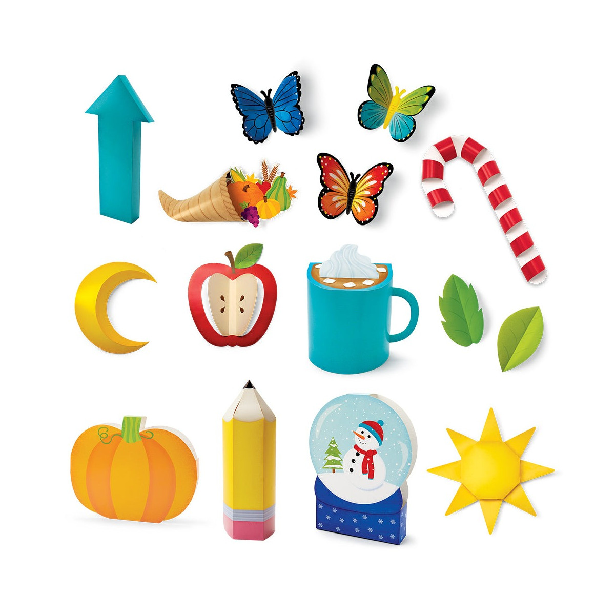 Bring the seasons to life with these 3D Pop Year-Round Seasons Bulletin Board. Set includes pieces that quickly assemble to make 3-D seasonal decorations for fall, winter, spring, and summer, as well as holiday decorations for Halloween, Thanksgiving, and Christmas.
