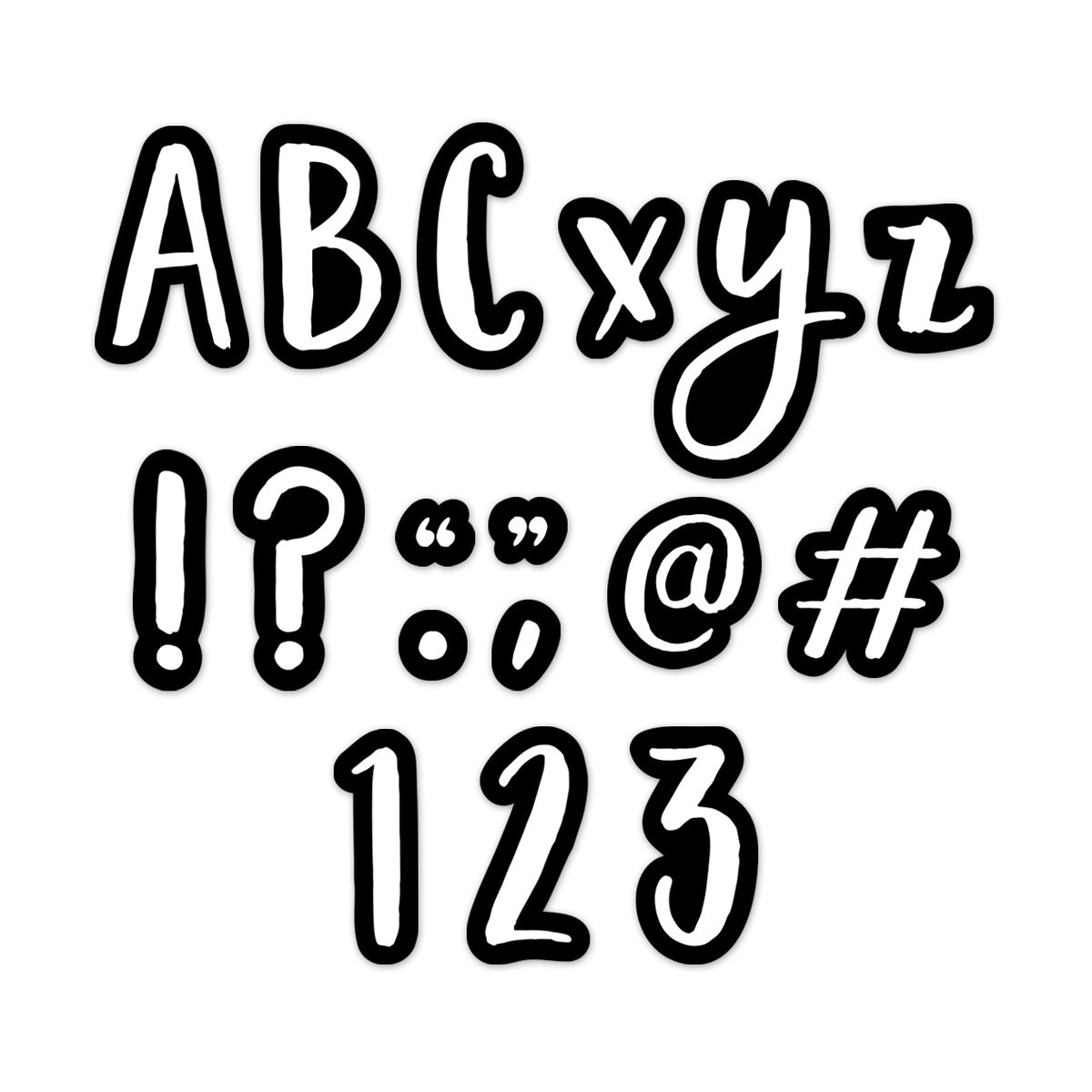 These Classroom Cafe 4" Designer Letters bring a modern flair to bulletin boards. These script-style punch out letters are white in the center with a thick black edging, making them highly visible from a distance. This package comes with 212 pieces, including upper and lowercase letters, punctuation marks, and numerals. Set also features social media symbols # and @. The simple, modern look of these punch-out letters makes them versatile for use on any bulletin board or display in a school, office, college dorm, senior living residence, dorm, church, or daycare center.