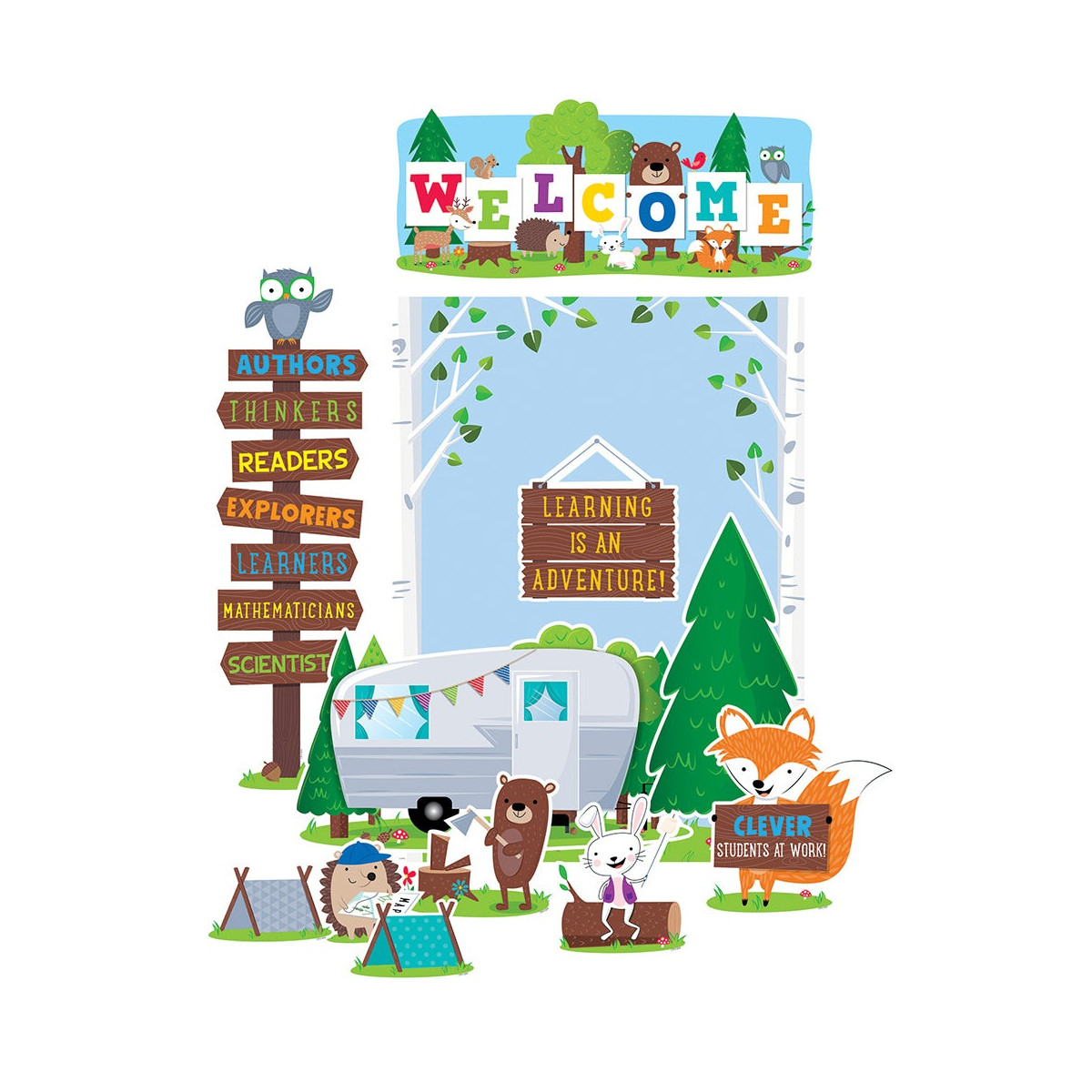 This cute camping-themed bulletin board will give students a warm and furry welcome! Set includes welcome sign, large vintage trailer, 36 student pup tents, 6 woodland animal accents, 2 large trees, and more. Pieces range in size from 17" x 71⁄2" to 53⁄4" x 33⁄4". 51 pieces.