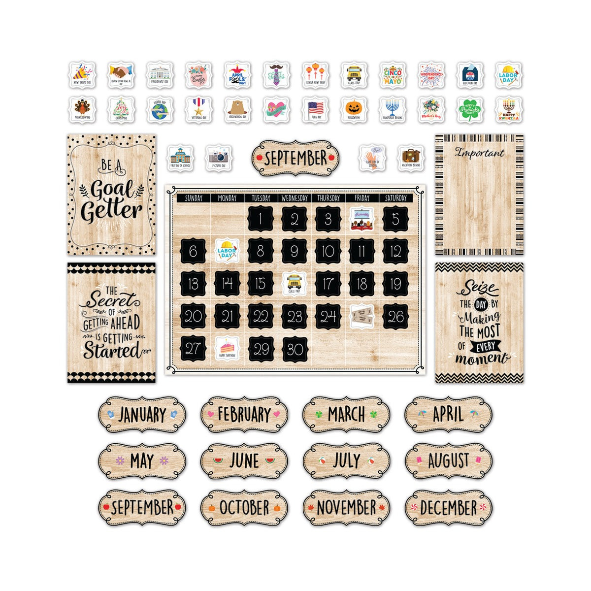 This 87-piece set includes a calendar chart, 12-month headlines, 31 pre-numbered calendar days, 23/30, 24/31, and 2 blank calendar days, 35 coordinating holiday and special day cards, and 4 motivational mini posters.