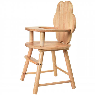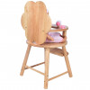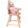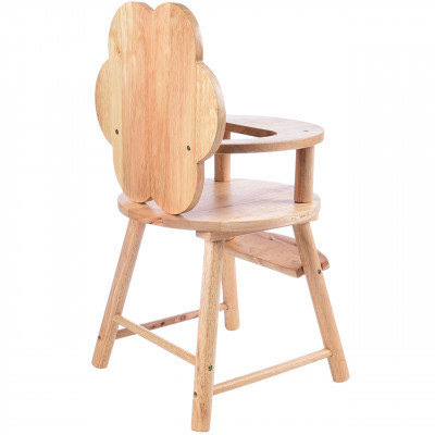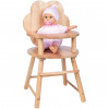 This hardwood constructed doll high chair has a permanently attached tray and will hold most large dolls. Size 15 inch W. x 15 inch D. x 30 inch H. Assembly required. Ages 2 yrs. +.