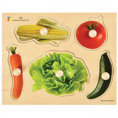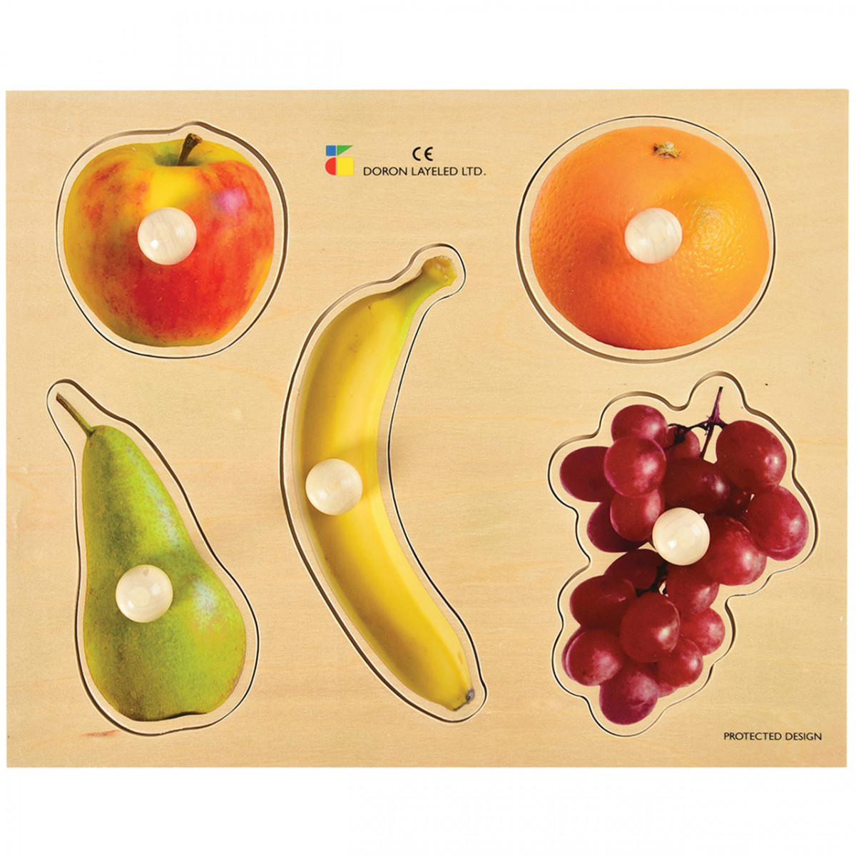 Fruit photo nobbed puzzle with realistic photographs Large knobs for little hands to easily grip. Size 11¾ inch W. x 9⅝ inch L. x ¼ inch thick. Ages 2 yrs. +.