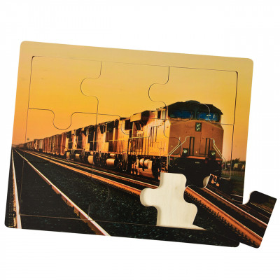 This 9 piece wooden inlay puzzle represents semi trucks mode of transportation with a real photograph.