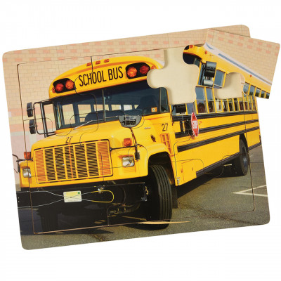 This 9 piece wooden inlay puzzle represents bus mode of transportation with a real photograph.