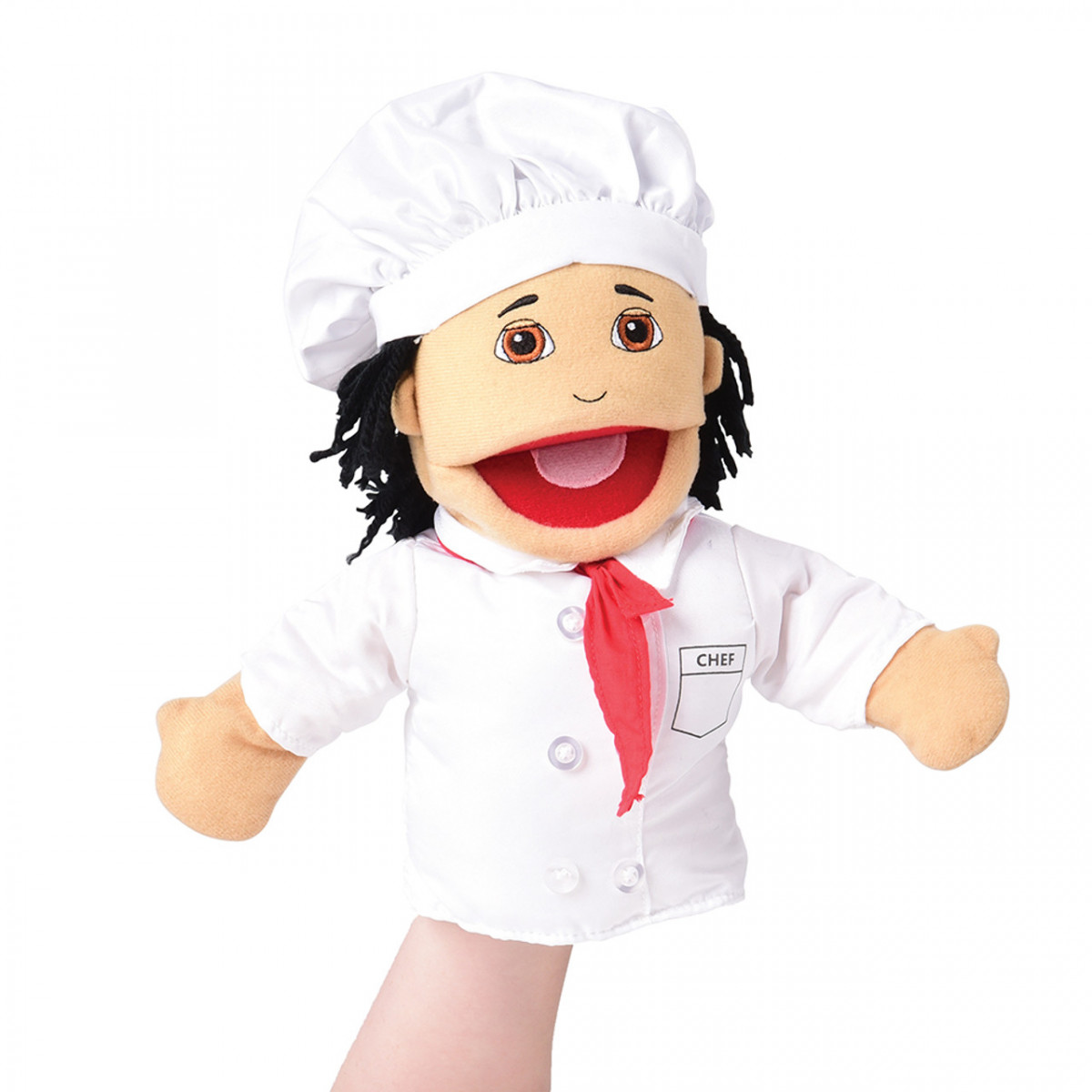 Role playing takes on a realistic dimension with this open-mouth hand puppet that depicts multi-ethnic men and women in non-sexist career roles. Has a soft stuffed head with embroidered facial features, yarn hair, and permanently attached clothing.