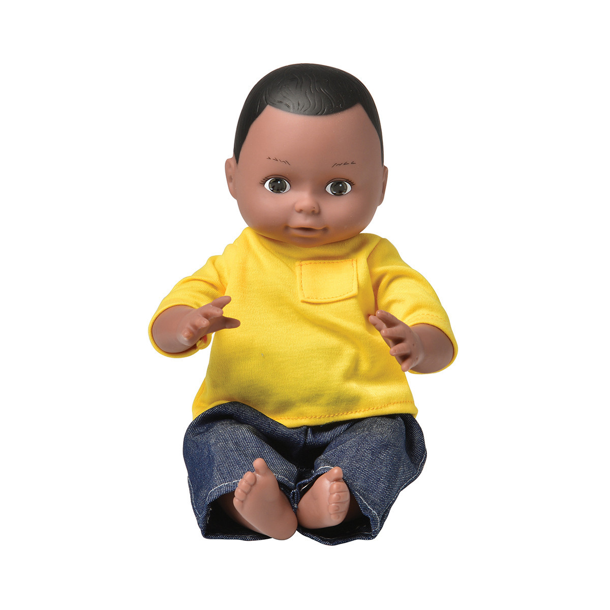 African American boy doll has ethnically accurate skin-tone, eyes, and hair coloring. Boy's hair is painted. Moveable head, arms, legs with safe, painted eyes and durable, washable clothing. Doll stands 13 inch. Ages 19 mos. +. See additional doll options below.
