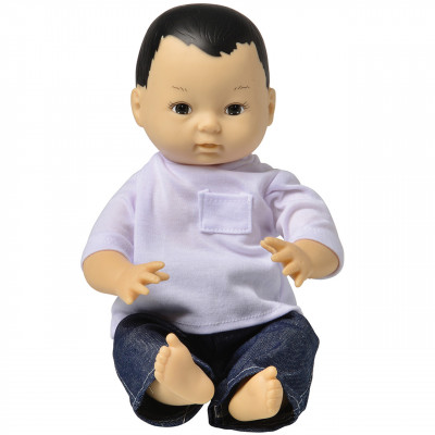 Hispanic boy has ethnically accurate skin-tone, eyes, and hair coloring. Boy's hair is painted on. Moveable head, arms, legs with safe, painted eyes and durable, washable clothing. Doll stands 13 inch. Ages 19 mos. +. Please see additional doll options below.