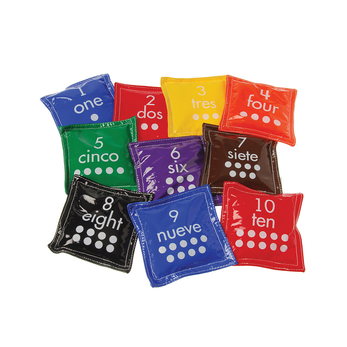 10 durable, 4” sq. vinyl bean bags. Numbers silk screened in English on one side and Spanish on the other. All ages.