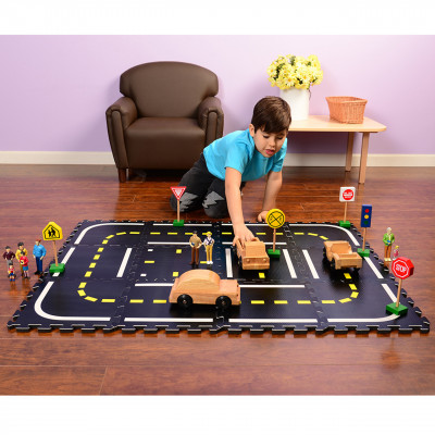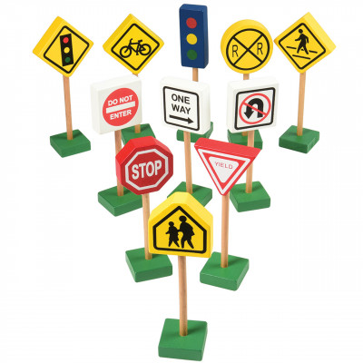 10 wooden signs and 1 stop light. All are approximately 7 inch H. and disassemble for easy storage. Ages 3 yrs. +.