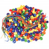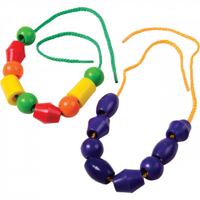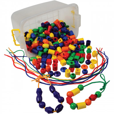 250 shiny plastic beads that come in a variety of 6 shapes and 5 different colors. Includes 8 tipped 20 inch long lacing cords. Cube bead is 3/4 inch squared. Ages 3 yrs. +.