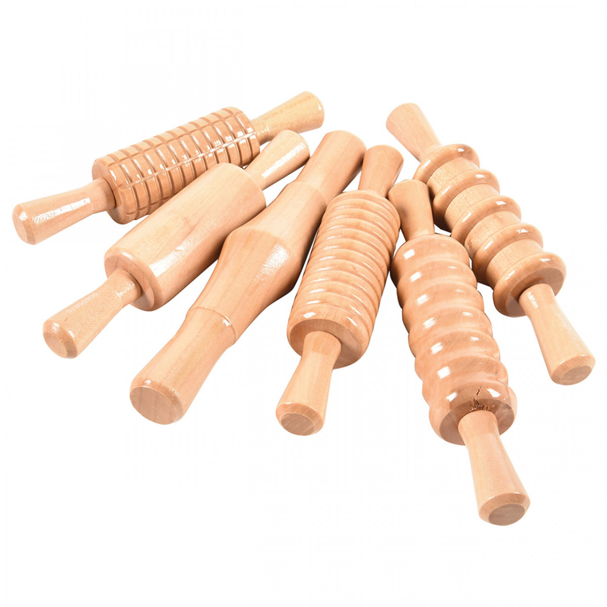Set of six, 6½ inch L. wooden rolling pins. Each has a different pattern. Ages 3 yrs. +.