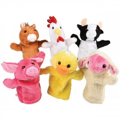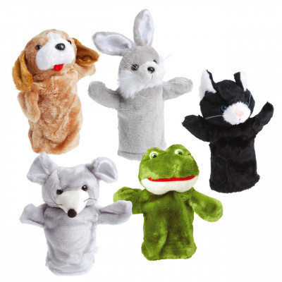 Family puppet set 16 pc. The 15" H mother and father and 13" H sister and brother have attractive outfits, yarn hair and happy, embroidered facial features with mouths to manipulate. Surface washable. Ages 19 mos +.