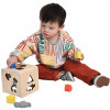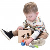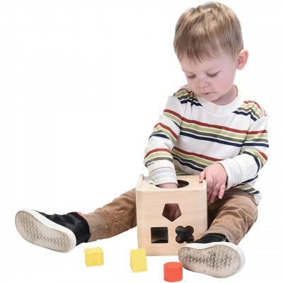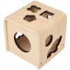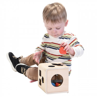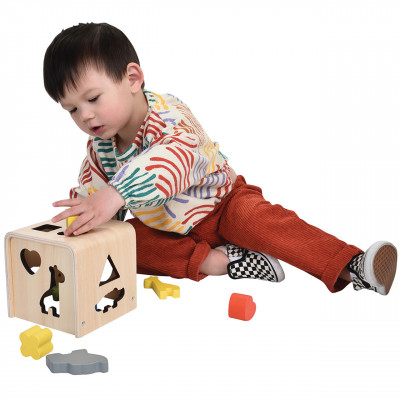 This wooden shape sorter measures 5.5" sq. It comes with 6 wooden shapes and 3 animals. Ages 12 mos. +.