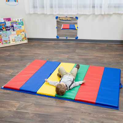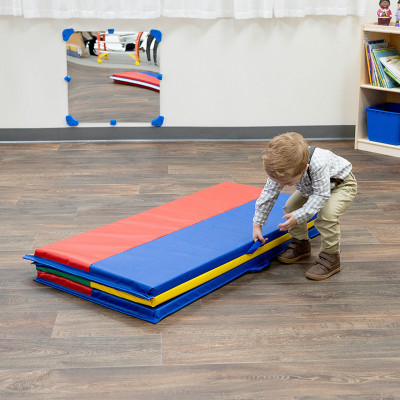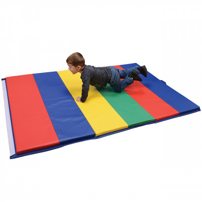 The 1.5" thick polyethylene foam is covered with heavy-duty, vinyl coated nylon and a 2" end strip with hook and loop fasteners, lets additional mats be connected. Folds for storage. Flame retardant foam and vinyl. Measures 4' x 6'.