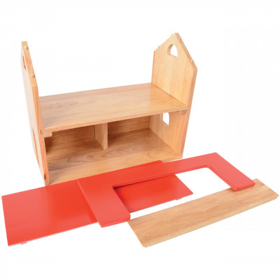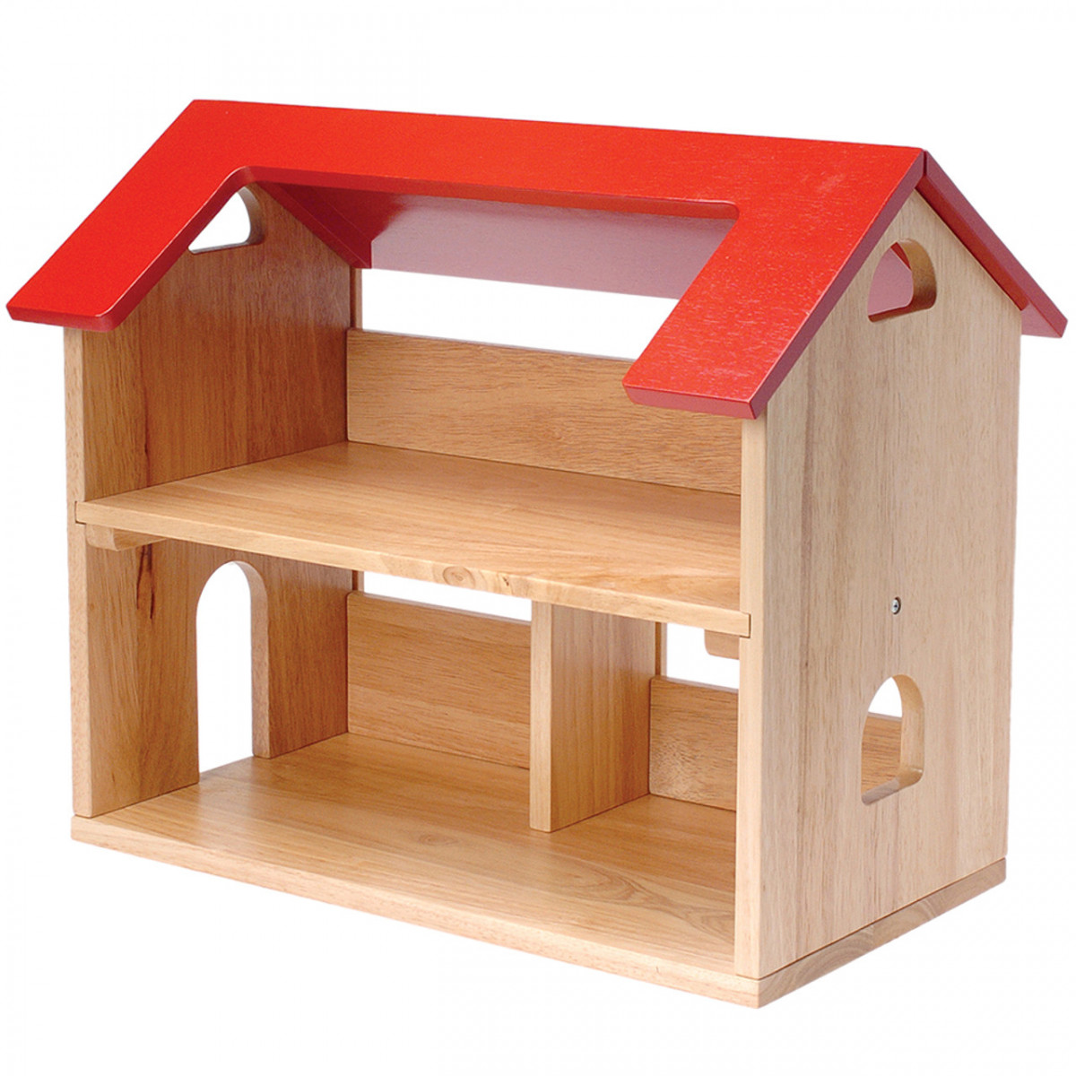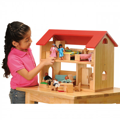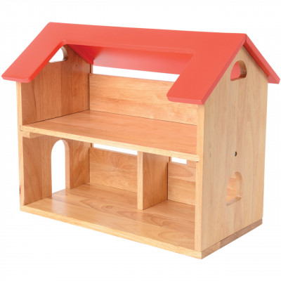 This sturdy, hardwood house is an ideal structure for a variety of play possibilities. It has a lift-up roof, removable second story and slide out interior walls. Size is 16½ inch W. 9¾ inch L. x 18 inch H. Assembly required. Ages 3 yrs. +.