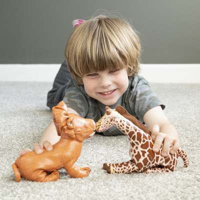 A set of jungle animals including a lion, tiger, zebra, elephant, rhino, and giraffe all made of soft, wipe-clean, vinyl. Giraffe is 8 1/2 inch H. All ages.