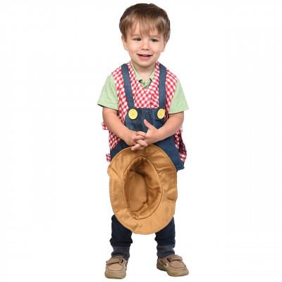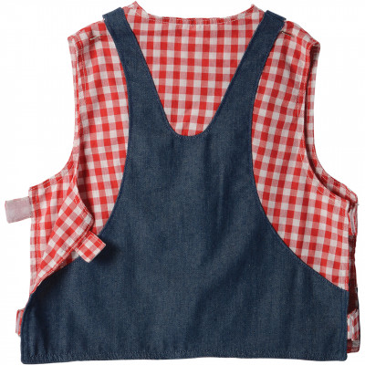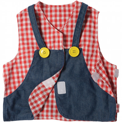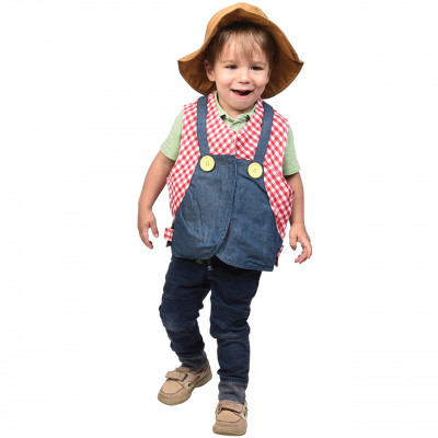 Role play is easy work with this simple slip-on, hook and loop side tab Farmer vest. This 16 inch L. x 15 inch W. vest features all hook and loop closures and sturdy easy wipe-clean fabric with embroidered accents. Ages 18 mos. +.