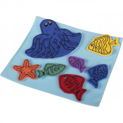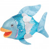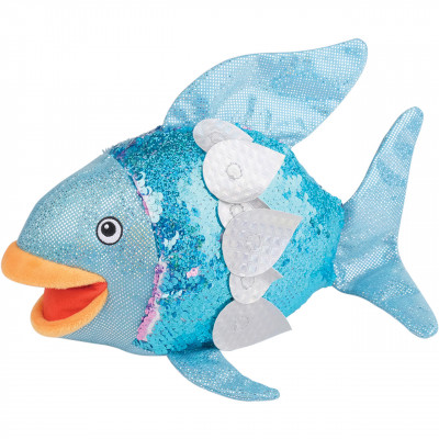 Props for this classic children's book Rainbow Fish. Stuffed rainbow fish hand puppet with removable scales and a shimmery reverse sequined body. Ages 3 yrs. +.