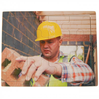 Spark the students interest in exploring different career options and discussing each role. This wooden inlay puzzle pictures a real photograph of a farmer at work.